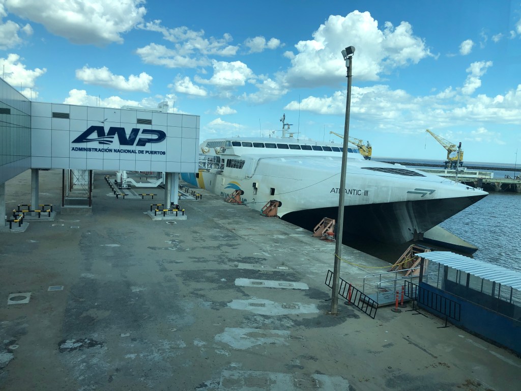 Nachdem der Flieger 1,5 Stunden Verspätung hatte und die Schnellfähre weg war haben wir die Bus-/Fähr-Kombi von Buquebus über Colonia genommen. D.h. zuerst 2 Stunden mit dem Bus von Montevideo nach Colonia und dann mit der Fähre nochmal eine Stunden nach Buenos Aires.