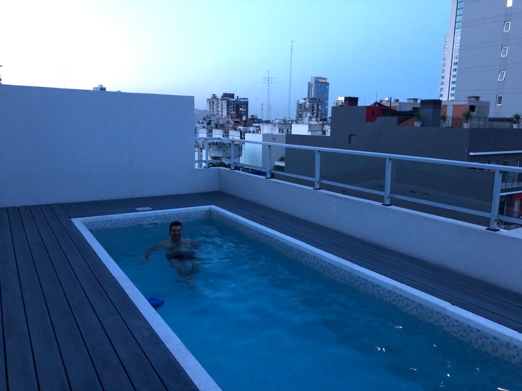 Unser AirBnB-Appartement ist Spitze. Wir wohnen im Herzen von Palermo im 7. Stock mit Blick auf die umliegenden Häuser. Im 10 Stock gibt es einen Swimingpool und eine Sauna (!). Auf die haben wir aber bei den aktuell 30 Grad gerne verzichtet.