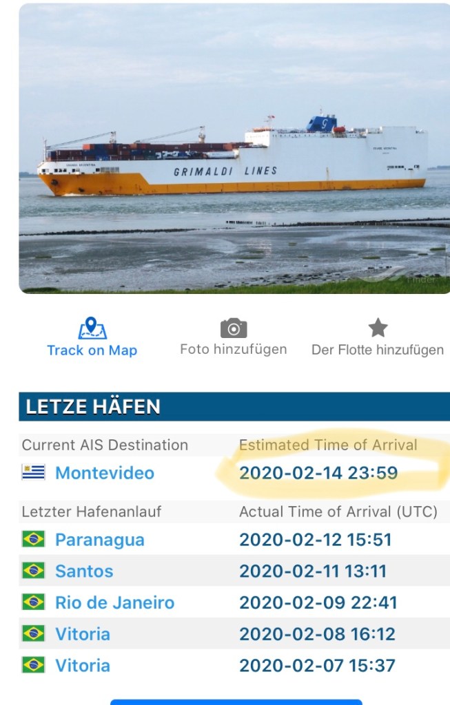 Am vorletzten Tag in Rio haben wir, wie jeden Tag die aktuelle Position der „Grande Argentina“ geprüft. Geplante Ankunft nach Fahrplan sollte der 18.02.2020 sein. Als nächster Hafen Zarate und dann Montevideo. D.h. mit den 2 Tagen Verspätung rechneten wir nicht mit der Ankunft vor dem 20.02. Ohje, was machen wir nur 5 Tage in Montevideo 🤔.