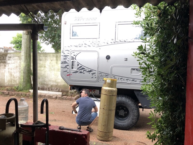 Auf dem Weg dorthin haben wir unseren leeren Gastank auffüllen lassen. In Uruguay gibt es leider keine Gas-Tankstellen so dass das Füllen einem Abenteuer gleicht. Jedenfalls hat der nette Fachmann Probleme den Schlauch wieder von unserem Anschluss runter zubekommen, so dass ungefähr 15 % unseres gefüllten Gas wieder raus war aus dem Tank und sich im Kasten ein kleiner Flüssiggas-See gebildet hat. Wenn man bedenkt was wir in Hamburg für ein Aufwand betrieben haben um das Gas aus dem Tank zu bekommen ….