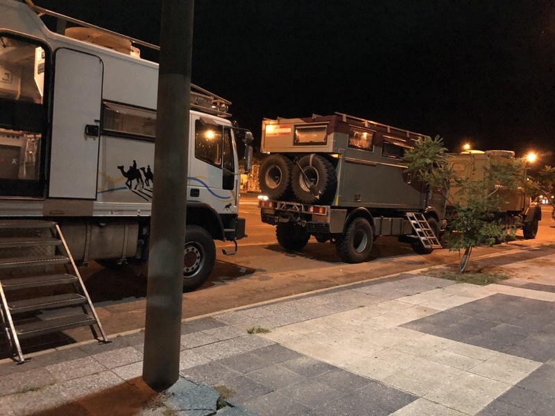 Abends haben wir auf der gegenüberliegenden Seite an der Uferpromenade von Mercedes Musik gehört. Neugierig geworden sind wir wieder über die Brücke zurück gefahren und was haben wir da gesehen …. 3 Expeditionsmobile.