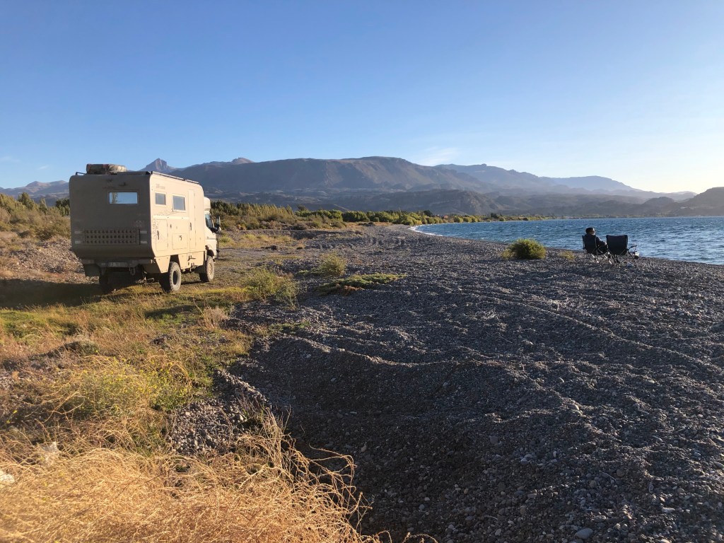 Hier wurden wir von einer ganzen Armada in Empfang genommen. Zuerst mussten wir zwei Seiten Fragebogen ausfüllen wo wir die letzten 30 Tage waren. Dann ging’s zum Fiebermessen. Nachdem wir das alles Bestanden haben wurden die Einreisedokumente bearbeitet und gestempelt. Dann wieder die obligatorische WoMo-Kontrolle nach rohen Lebensmittel. Da wir in El Calafate großzügig eingekauft hatten, es war ja nicht der Plan so schnell nach Chile zu fahren, mussten wir alles gut verstecken und es war auch gut so. 3 Kontrolleure hatten Zeit sich um unser Auto zu kümmern. Wir mussten alle Klappen und Schränke aufmachen und unser WoMo hat viele (!). So intensiv wurden wir vorher noch nie kontrolliert, aber außer einem Opfer-Ei, einer Opfer-Banane und einer Paprika die ich beim Verstauen übersehen habe, war alles ok. Nur Timo musste ein bisschen Schwitzen denn beim Öffnen der Klappe an der Heckgarage ist dem Kontrolleur ein Gecko entgegen gesprungen. Aber der Herr war ganz entspannt und wir durften nach Chile einreisen.