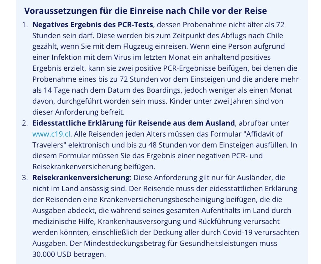 In Santiago angekommen haben wir für die ganze Einreiseprozedur ca. 2 Stunden benötigt. Zuerst zur Control Sanitario zur Prüfung unserer Einreisevoraussetzungen, dann zum PCR-Test (kostenlos !). Danach zur PDI (Passkontrolle). Hier gibt es den Einreisestempel für 90 Tage Aufenthalt in Chile. Dann Gepäck abholen und mit dem Gepäck noch durch den Zoll. Uff 😅.