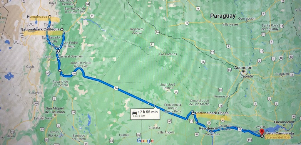 Nachdem die Hälfte unseres Urlaubs jetzt vorbei war, wurde es Zeit den langen Weg von West nach Ost durch den Chaco, einer weiten, flachen Savannenlandschaft in Angriff zu nehmen. Von Humahuaca bis zu unserem nächsten Ziel die Esteros del Iberá sind es 1.200 km 😳. Ok, das wird nichts in einem Tag, da brauchen wir noch ein paar Zwischenstopps.