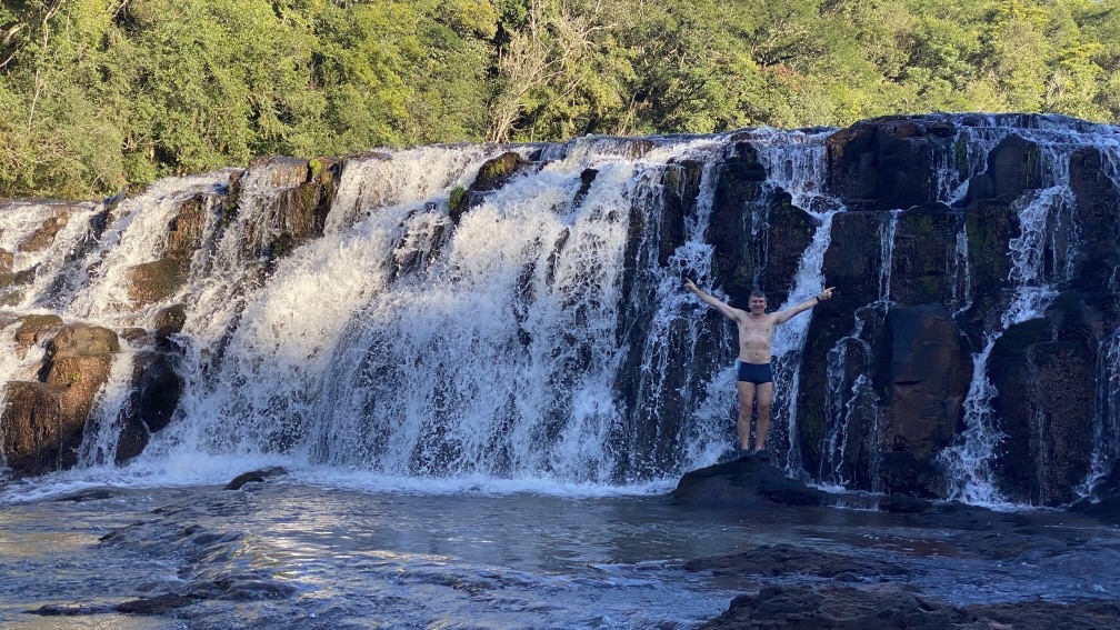 Weiter die BR-277 entlang, auf und ab, Kurve links, Kurve rechts durch hügelige Landschaft, unterbrochen durch einen Einkaufsstop und einer Picknick-Pause sind wir dann auf der Suche nach einem Übernachtungsplatz am kleinen Wasserfall des Rio Tapera gelandet.