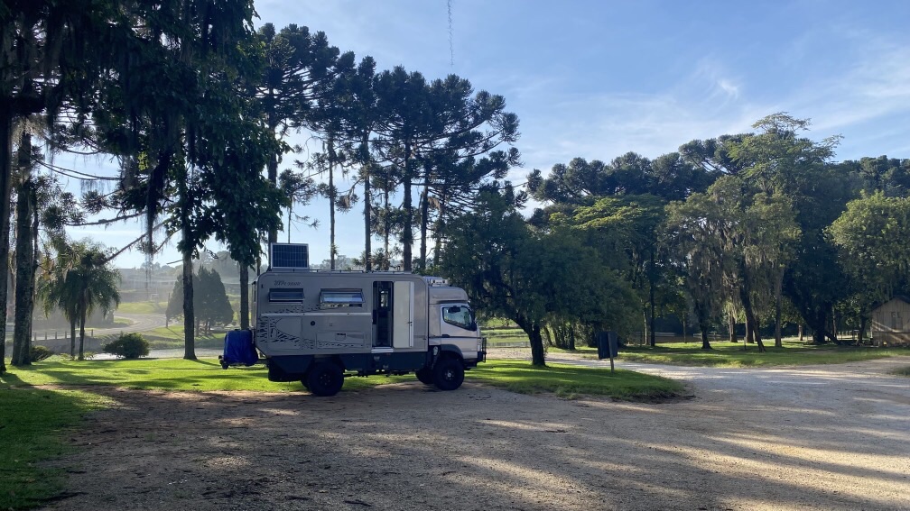 Auch Curitiba hatten wir gar nicht geplant, da wir da schon mal in 2022 waren, aber unsere Vorderreifen hatten sich so seltsam abgefahren, dass wir da mal nach unseren Stoßdämpfen schauen lassen wollten. Die Werkstatt hatte am Freitag schon zu, bis wir im Feierabendverkehr endlich in Curitiba aufgeschlagen sind. So parkten wir auf dem großen beleuchteten und bewachten Parkplatz am Parque Barigui, noch nicht ahnend das der Parkplatz die nächsten 4 Tage unser zu Hause werden würde 😂.