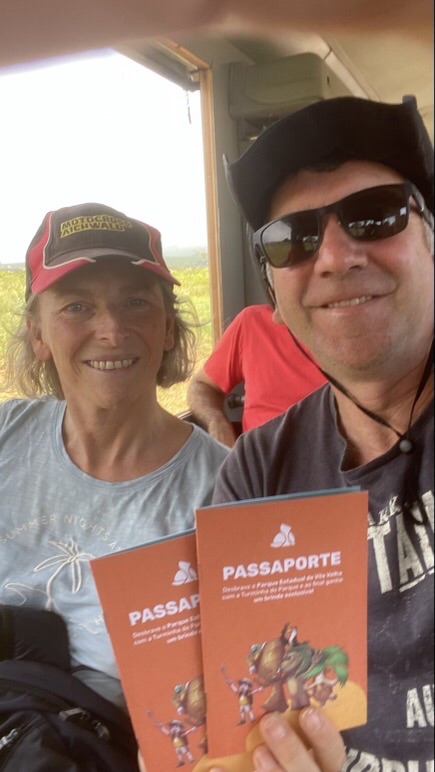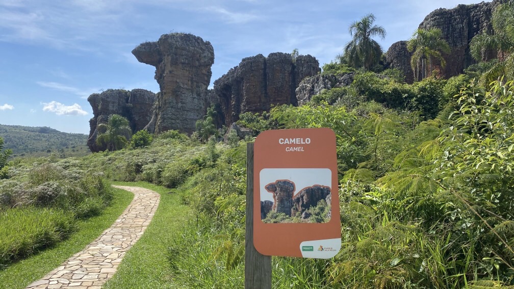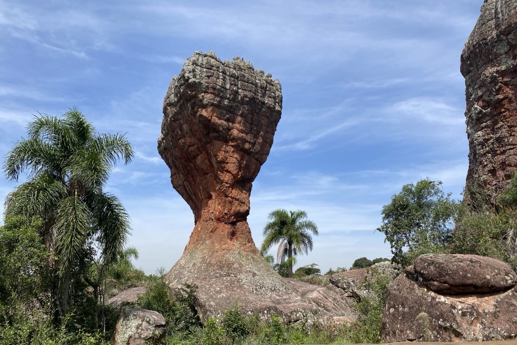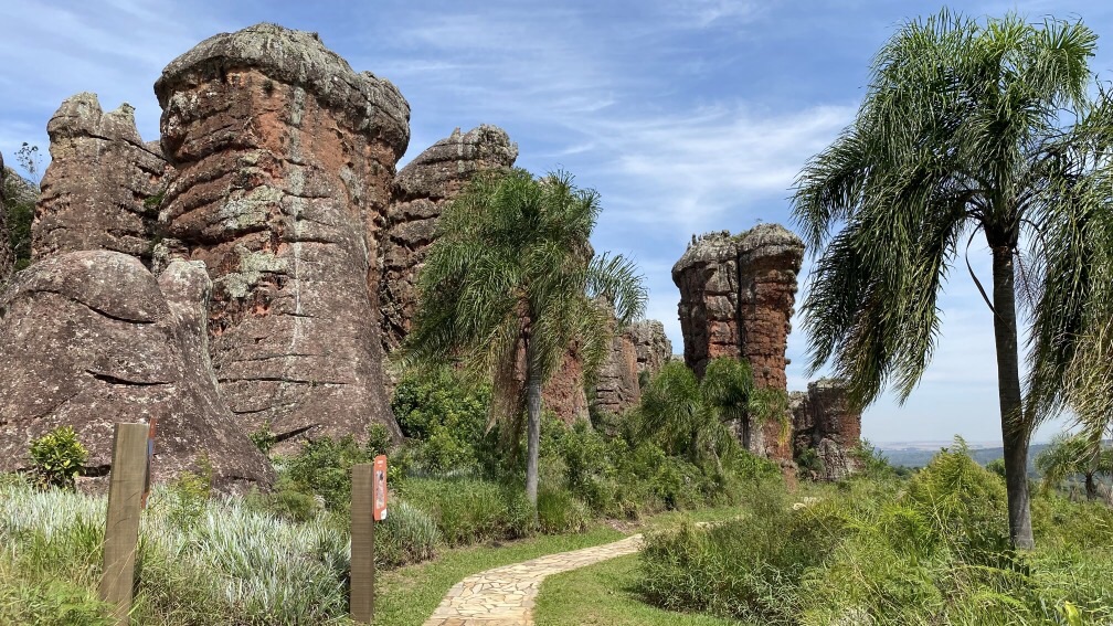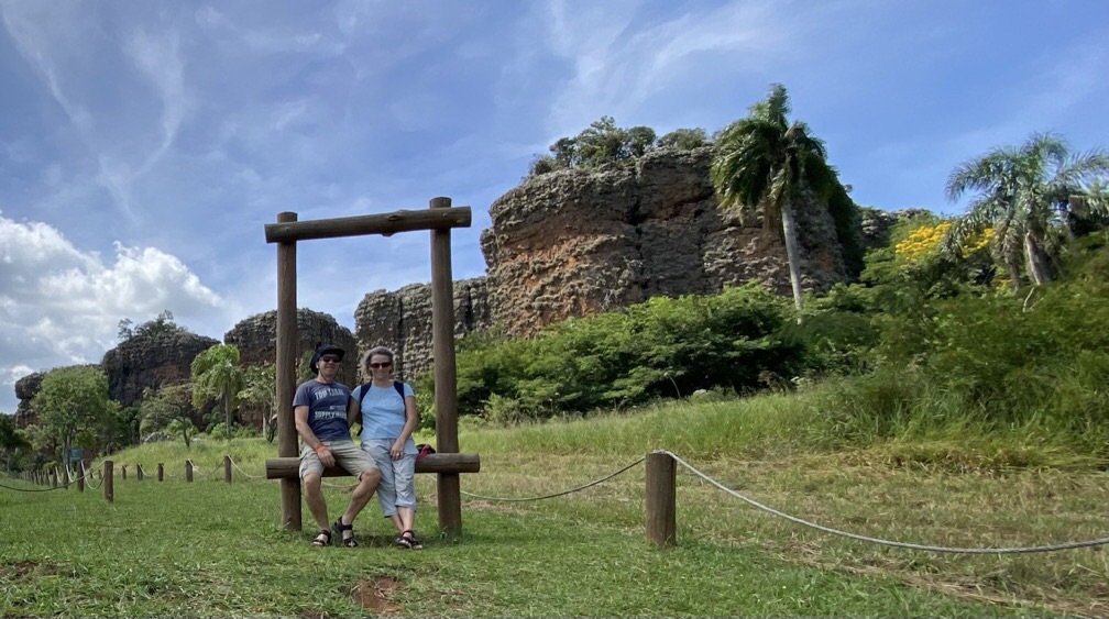Jetzt ging es aber endlich los um möglichst vor der großen Hitze die Sandsteinfelsen von Vila Velha zu besichtigen. Der Park wird touristische bestens vermarktet und der Eintritt hätte lt. der Webseite das doppelte kosten sollen, als wir letztendlich bezahlt haben. Entweder gingen wir schon als Brasilianer durch 😉 oder es lag an der Nebensaison, denn es waren so gut wie keine weiteren Besucher anwesend. Vom Visitor Center wurden wir dann mit dem Bus den knappen Kilometer zu den Felsen gekarrt.