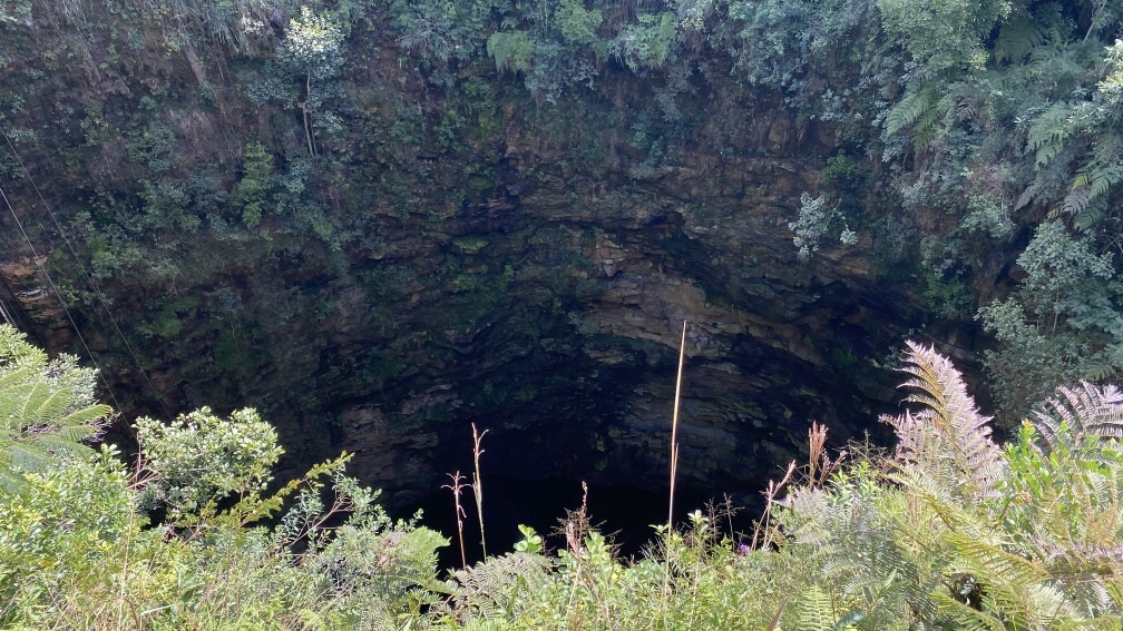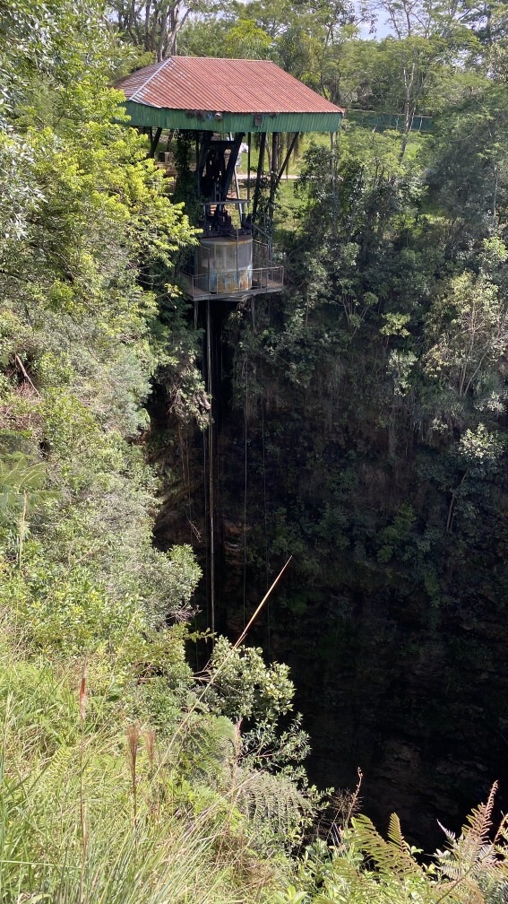 Die zweite Tour war dann eine längere Busfahr zur Lagoa Dourada, einer mit Wasser gefüllten Höhle die angeblich in der Sonne golden leuchten soll und danach zu den Furnas, zwei eingestürzte Höhlen die sich als tiefe, teilweise mit Wasser gefüllten Löcher zeigten. Hier gab es wohl mal vor längerer Zeit einen Aufzug mit dem man in so ein Loch hinunter gefahren werden konnte. Aktuell ist der Aufzug außer Betrieb.