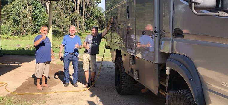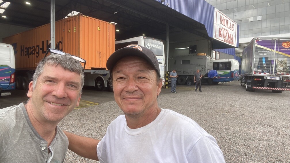 Unser kleiner LKW fiel zwischen den PKWs auf dem Parkplatz schon ein bisschen auf und so hatten wir ständig neugierigen Besuch. Die Unterhaltungen waren meist schnell beendet, da wir kein portugisisch können und die meisten Brasilianer nur portugisische sprechen. Auch mit unserem rudimentären Spanisch funktionierte keine Konversation. Nur Jeferson Luiz von Grafen (!), natürlich stolz auf seinen deutschen Nachnamen, war besonderst hartnäckig und mit Hilfe von Google Translater funktioniert die Unterhaltung ganz gut. Wir erzählten Ihm dass wir am Montag einen Termin in einer Werkstatt haben um die Dämpfer prüfen lassen wollten und bemerkten nebenbei das die Gummipuffer auch verschlissen sind. Er kannt die Werkstatt und meinte er wolle gleich Montag morgen anrufen und dafür sorgen das alles gut funktioniert.